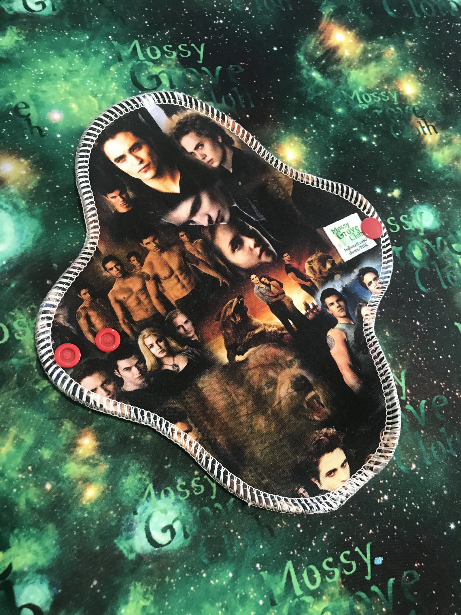 Reusable Pad- Outer layer- Poly Knit or cotton spandex, then a hidden layer of windpro fleece, and an inner layer of bamboo velour or cotton spandex. Then there is an exterior core made of multiple layers of heavy bamboo fleece and bamboo velour or cotton spandex as a topper (No core on liners).